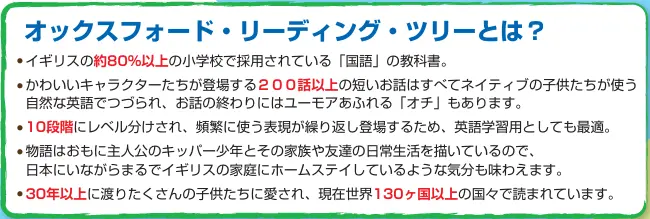 Oxford Reading Treeはイギリスの学習要項に基づき現地の幼稚園~小学校低学年向けに書かれていますが、日本のお子様は英語レベルに合わせてお選びください。もちろん多読学習では中学生以上~社会人の方にもお楽しみいただけます。